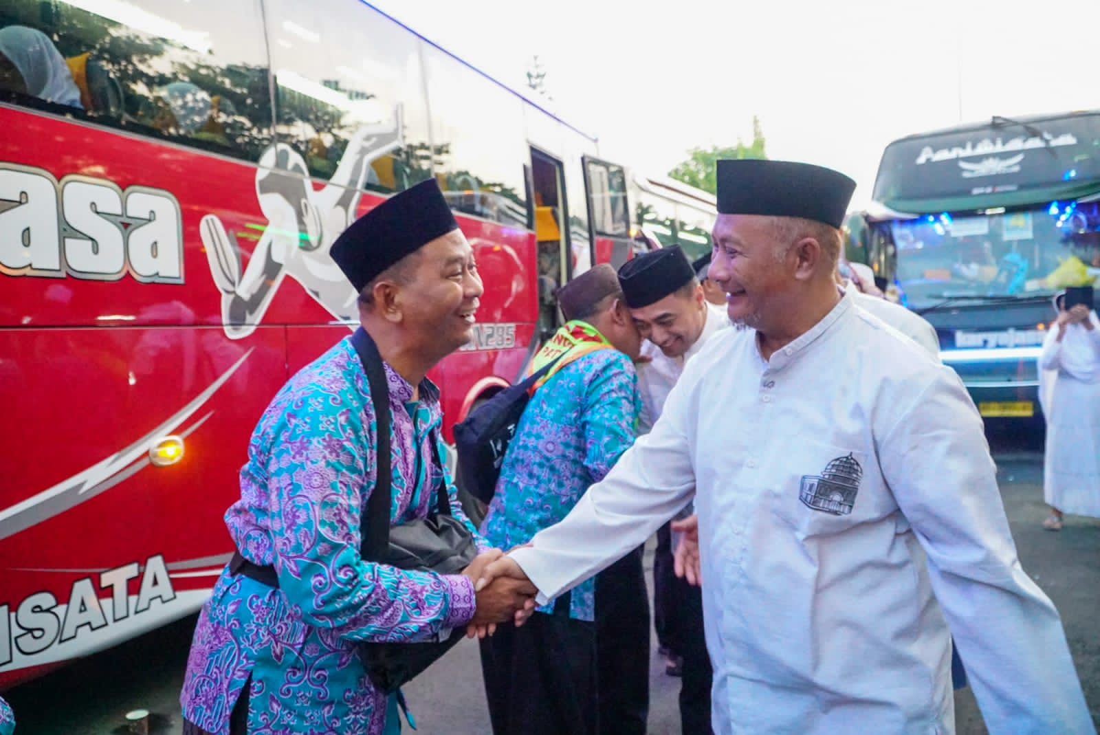Henggar bersama Forkopimda menyempatkan menyapa dan mengucapkan selamat jalan kepada seluruh calon jemaah haji yang sudah berada di dalam bis.