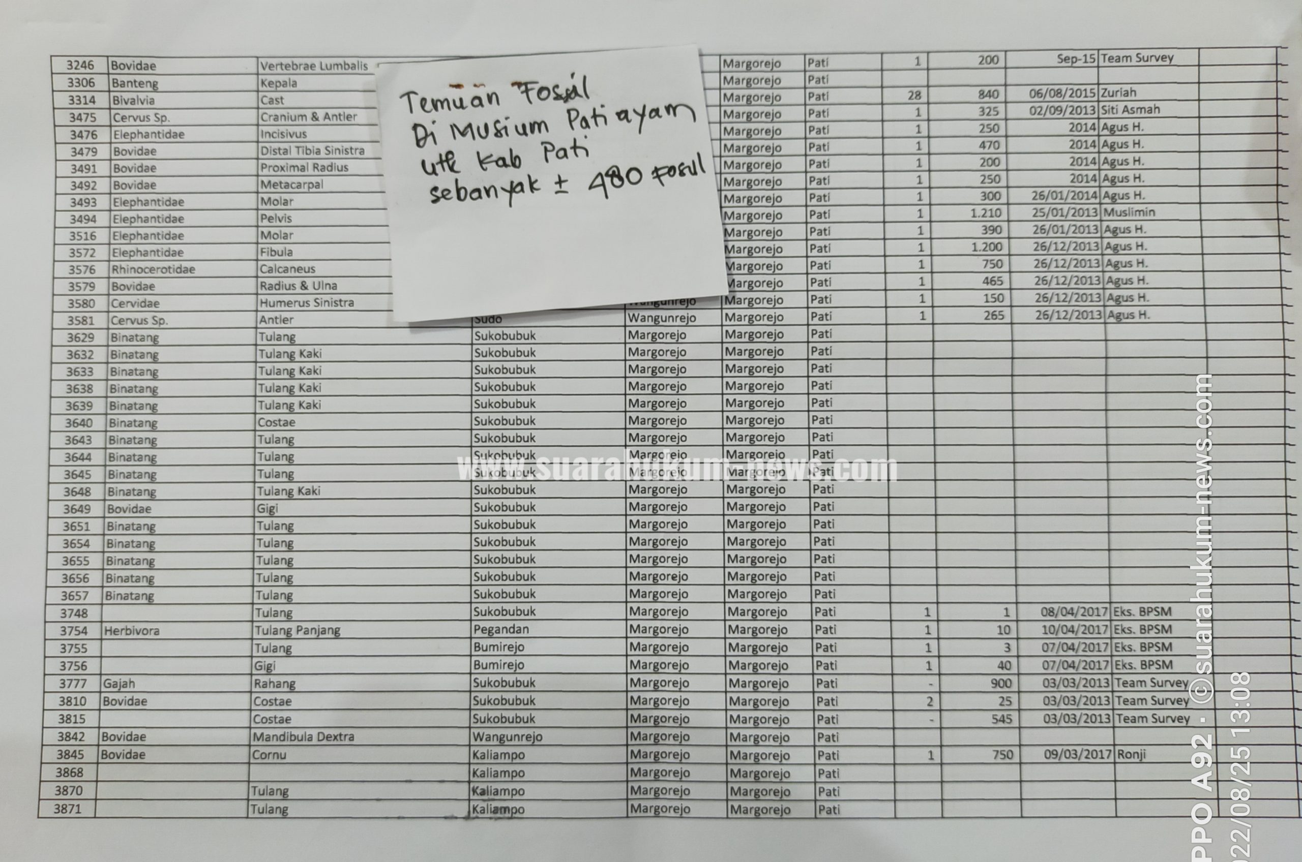 “Data temuan fosil dari Kabupaten Pati ini, kami minta dari Pak Jamin selaku Juru Pelihara di Museum Patiayam Kudus, kemarin (Selasa-Rabu, tanggal 23-24 Agustus 2022 di Hotel @HOM). Saat menghadiri acara Fokus Group Discussion (FGD) yang diselenggarakan oleh Dinas Pendidikan dan Kebudayaan Provinsi Jawa Tengah, dengan pembahasan tentang Kajian Zonasi Cagar Budaya (Kawasan Patiayam),” tandas Trevita sembari menunjukkan data temuan fosil dari Kabupaten Pati yang di titipkan di Museum Patiayam, Kudus.