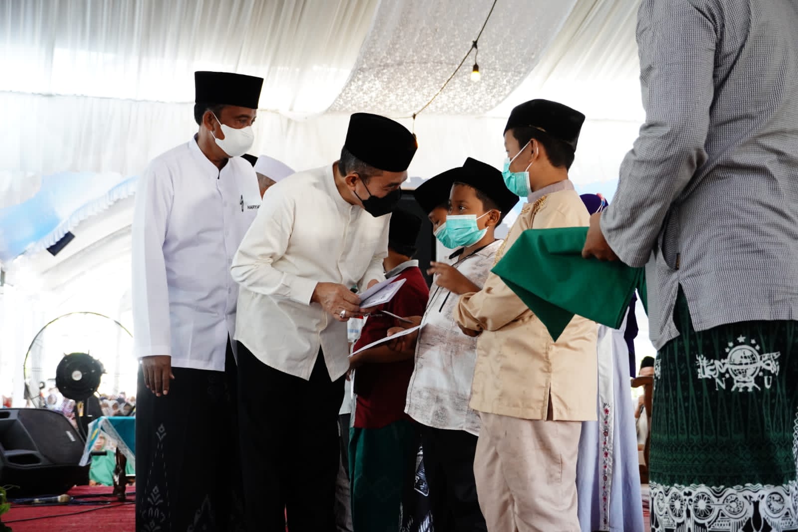 Selain mengikuti kegiatan tahlil umum dalam rangka haul ke 84 Almaghfurlah KH.Sholeh Amin, Bupati Pati juga memberikan santunan anak yatim piatu yang diadakan di halaman Madrasah Miftahul Huda Tayu.