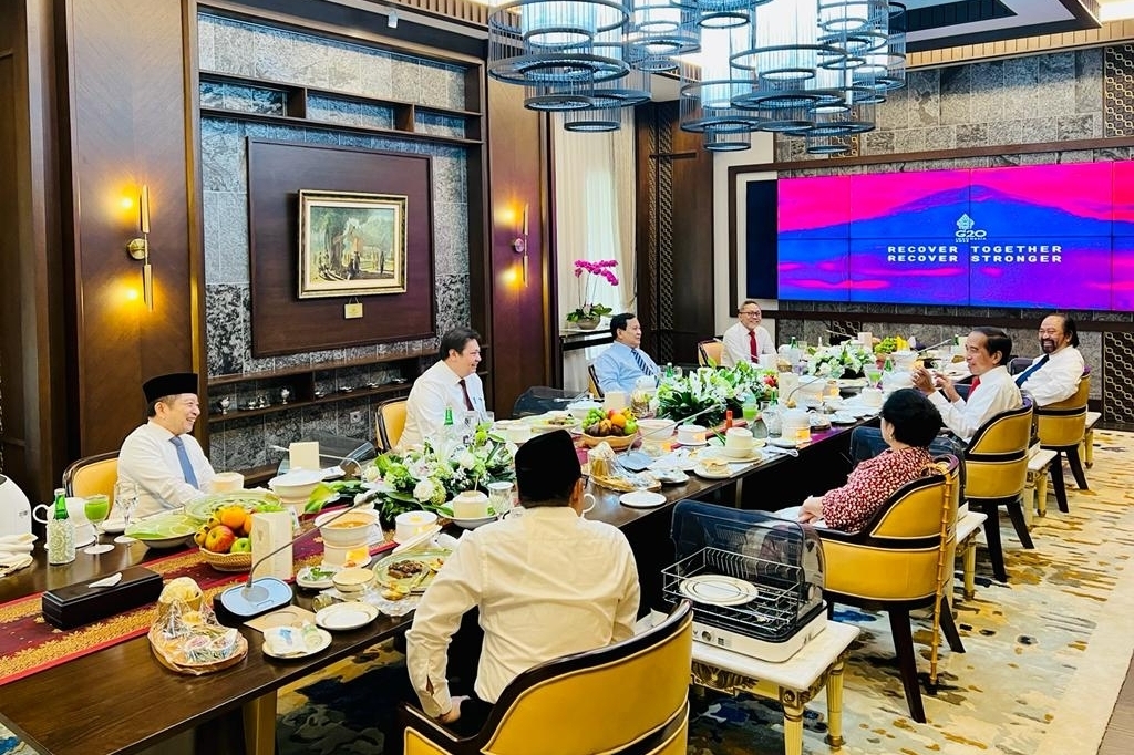 Presiden Jokowi kemudian mengambil tempat duduk di tengah, diapit oleh Ketua Umum Partai Demokrasi Indonesia Perjuangan Megawati Soekarnoputri dan Ketua Umum Partai Nasional Demokrat Surya Paloh. Tepat di seberangnya, duduk Ketua Umum Partai Gerindra Prabowo Subianto.