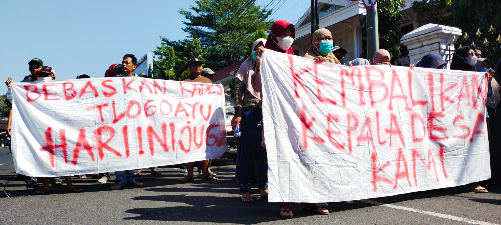 Warga yang datang dengan menggunakan sound sistem dan sejumlah baliho bertuliskan “Tindak Tegas Oknum Polda Jateng” dan “Kembalikan Kepala Desa Tlogoayu” tersebut telah mendesak kepada aparat penegak hukum agar Kepala Desa bisa segera dibebaskan.