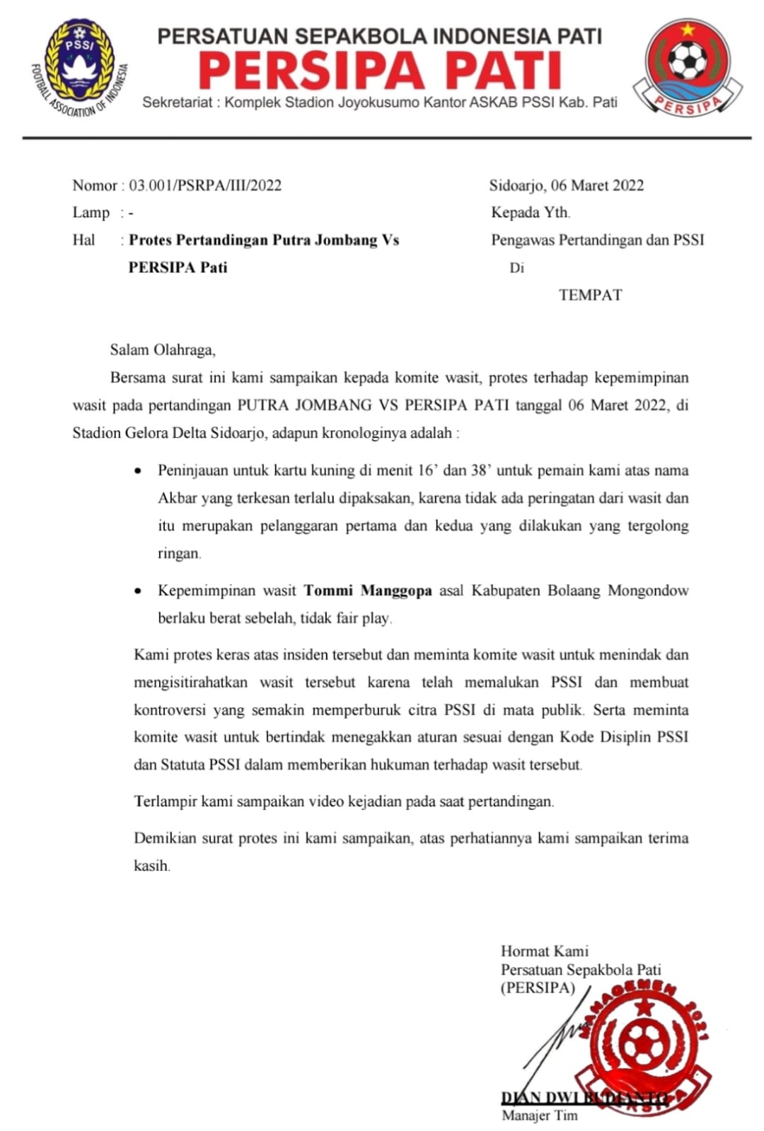 “Kami protes insiden tersebut dan meminta komite wasit untuk menindak dan mengistirahatkan wasit tersebut karena telah memalukan PSSI dan membuat kontroversi yang semakin memperburuk citra PSSI di mata publik. Serta meminta komite wasit untuk bertindak menegakkan aturan sesuai dengan Kode Disiplin PSSI dan Statuta PSSI dalam memberikan hukuman terhadap wasit tersebut,” pinta Surat Surat, Nomor; 03.001/PSRPA/III/2022 yang ditujukan kepada Pengawas Pertandingan dan PSSI tentang “Protes Pertandingan Putra Jombang Vs Persipa Pati, Minggu (06/03).