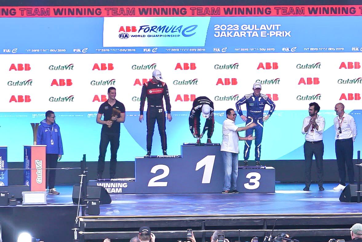 Juara I diraih Pascal Wehrlein (Porsche Team). Disusul Jake Dennis (Avalanche Andretti), dan Maximillian Gunther (Maserati MSG Racing). Mereka naik podium setelah berhasil menaklukan AGI Jakarta International Eprix Circuit, menyelesaikan 36 lap dengan menempuh jarak sekitar 85,32 Km.