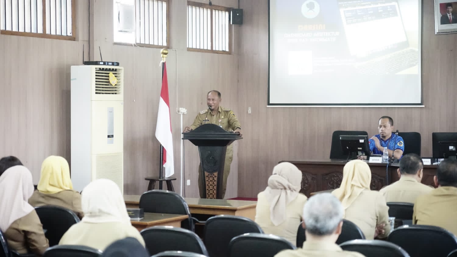 Pati, www.suarahukum-news.com | Penjabat Bupati Pati Henggar Budi Anggoro bersama Sekretaris Daerah Kabupaten Pati Jumani, Senin (26/6) menghadiri launcing Dashboard Arsitektur SPBE Pati Informatif (Darsini) di ruang Penjawi Setda Kabupaten Pati. (26/06)