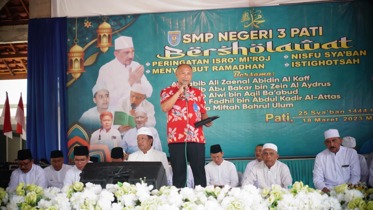 Pati, www.suarahukum-news.com | Sabtu, (18/3) bertempat di SMP Negeri 3 Pati, Pj Bupati Pati Henggar Budi Anggoro menghadiri acara SMP Negeri 3 Pati bersholawat dalam rangka Peringatan Isra Mi’raj dan menyambut bulan suci Ramadhan.(19/03)
