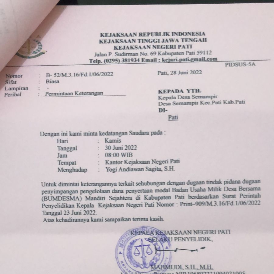 Adapun Pemanggilan terhadap puluhan Kades ini sesuai dengan Surat Undangan yang dilayangkan oleh pihak Kejaksaan Negeri Pati, dengan agenda Permintaan Keterangan. Yang merujuk pada Suat Perintah Penyelidikan Kepala Kejaksaan Negeri Pati Nomor: Print-909/M.3.16/Fd.1/06/2022, Tanggal 23 Juni 2022.